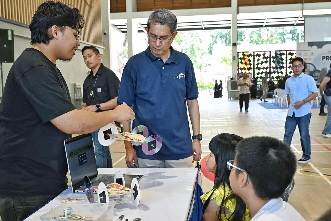 LAWAT RERUAI: Pemangku Menteri Bertanggungjawab bagi Ehwal Masyarakat Islam, Profesor Madya Dr Muhammad Faishal Ibrahim (tiga dari kiri), beramah mesra bersama hadirin semasa acara ‘Project Stem Up!’ di Anjung@Wisma Geylang Serai (WGS) pada 6 September. - Foto KHALID BABA