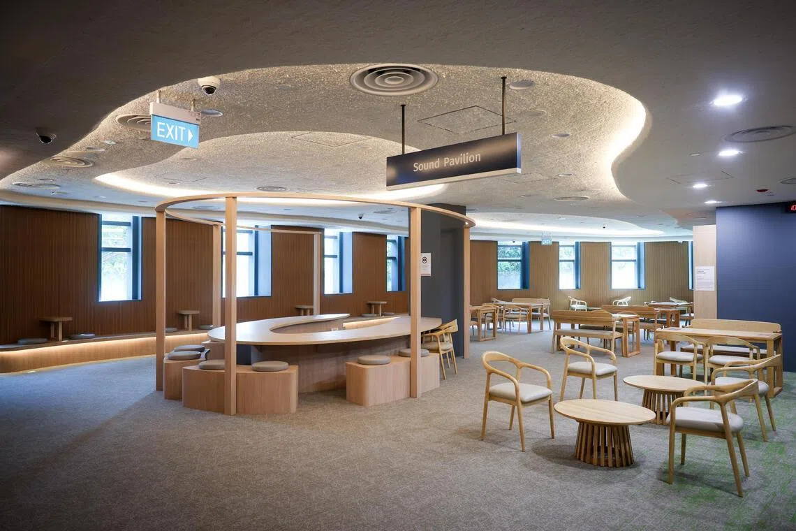 Melangkah ke tingkat pertama Perpustakaan Bukit Batok yang baharu, pengunjung disambut dengan bunyi latar yang menenangkan.