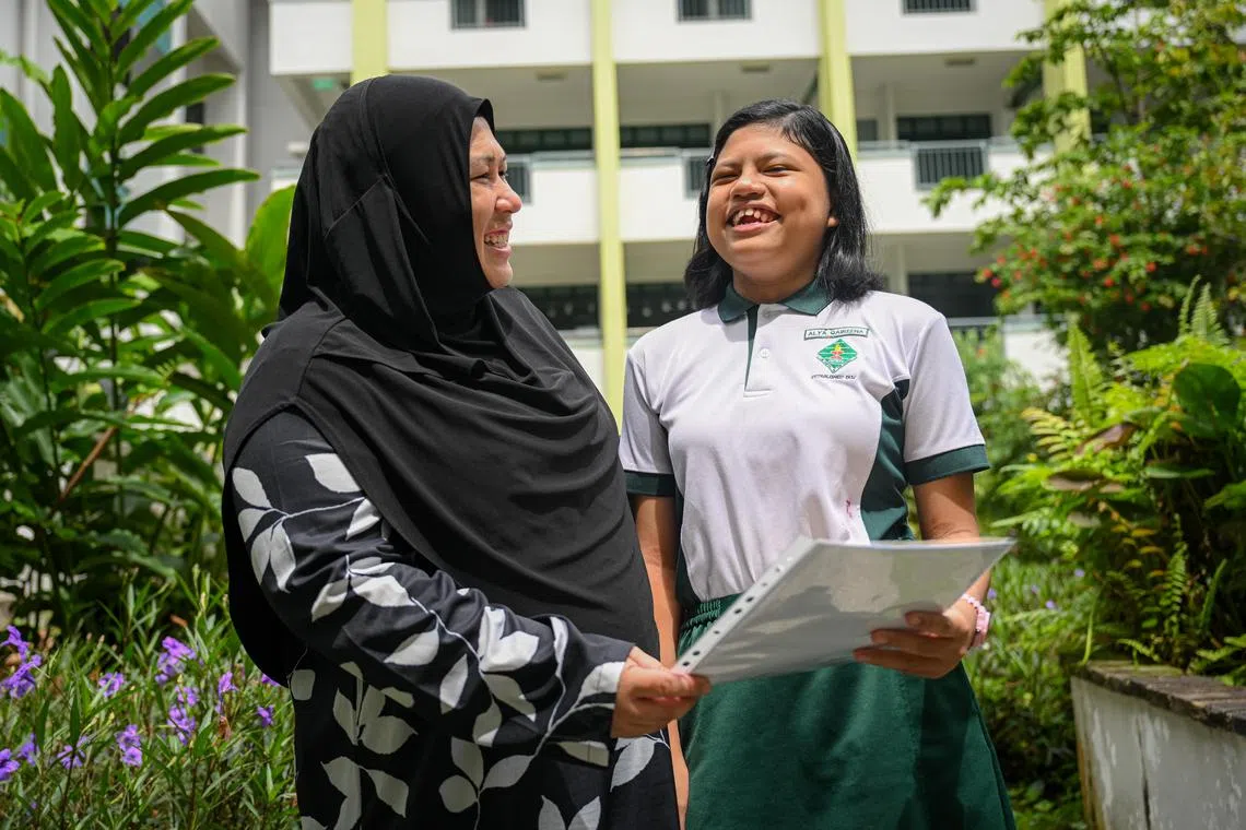 KISAH KEJAYAAN: Alya Qaireena Mohamed Rafi (kanan) menerima keputusan Peperiksaan Tamat Sekolah Rendah (PSLE) dengan ditemani ibunya, Cik Nurkamaliah Yusoff (kiri). - Foto SHAFIQ APANDI