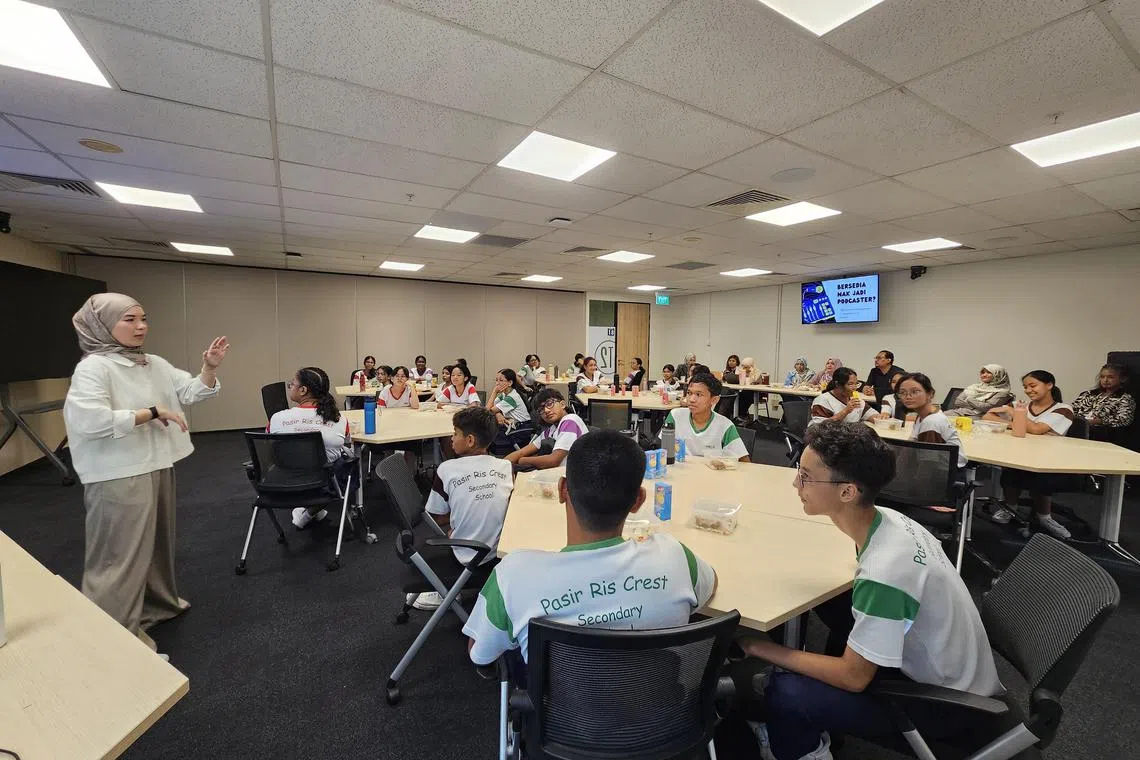 PELAJARI ASAS ‘PODCAST’: Para pelajar dari Sekolah Menengah Pasir Ris Crest menjalani bengkel ‘podcast’ bersama Penerbit Eksekutif Berita Harian, Cik Aisyah Nordin, pada Mei 2024. - Foto fail