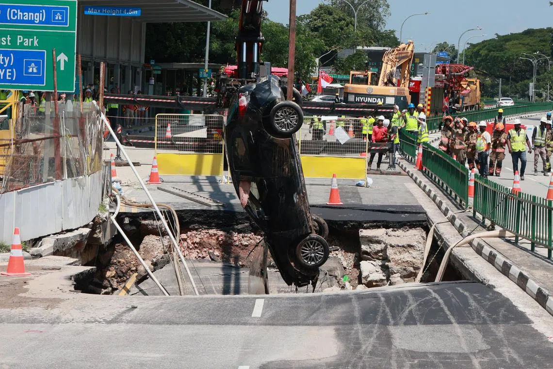 Seorang wanita dibawa ke hospital selepas keretanya terjatuh ke dalam lubang benam di Tanjong Katong Road, berhampiran kondominium One Amber, pada 26 Julai.