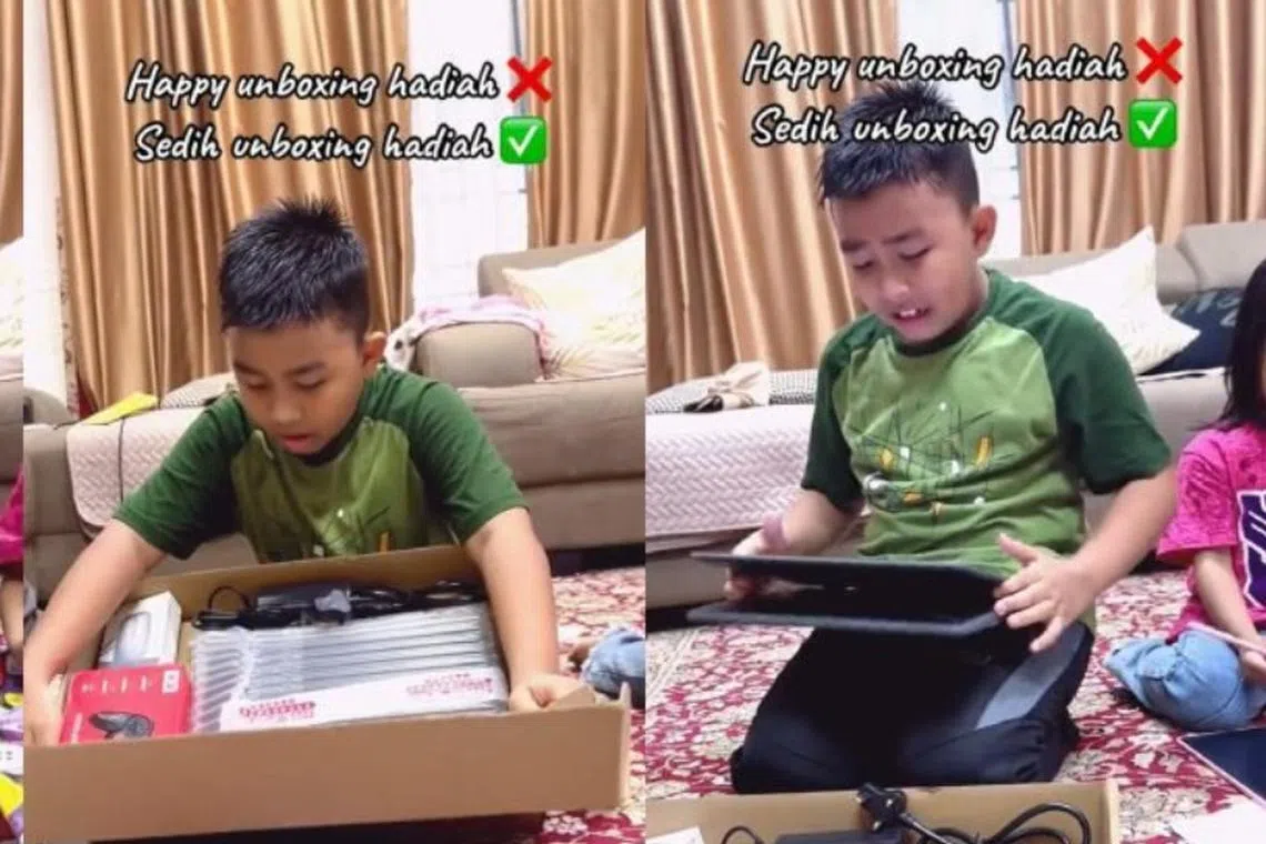 Anak lelaki terharu dapat komputer riba sebagai kejutan daripada ibu bapa