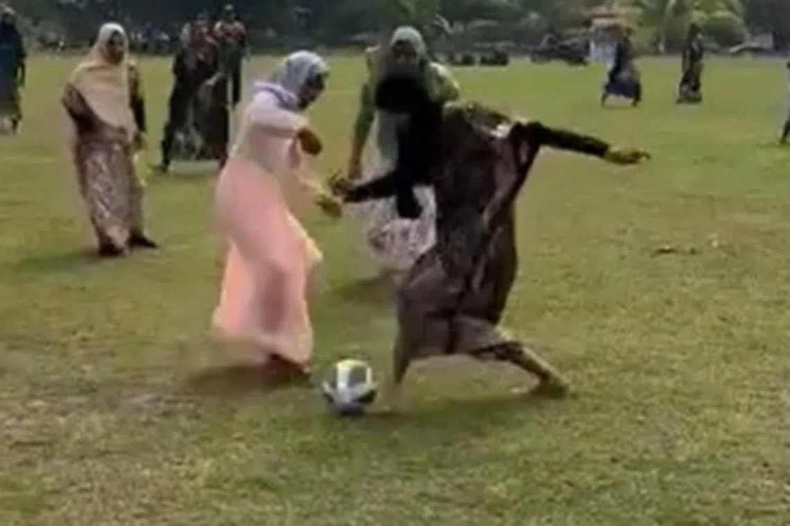 Video ringkas 20 saat itu turut menunjukkan mereka berkaki ayam sambil ‘berentap’ di padang.