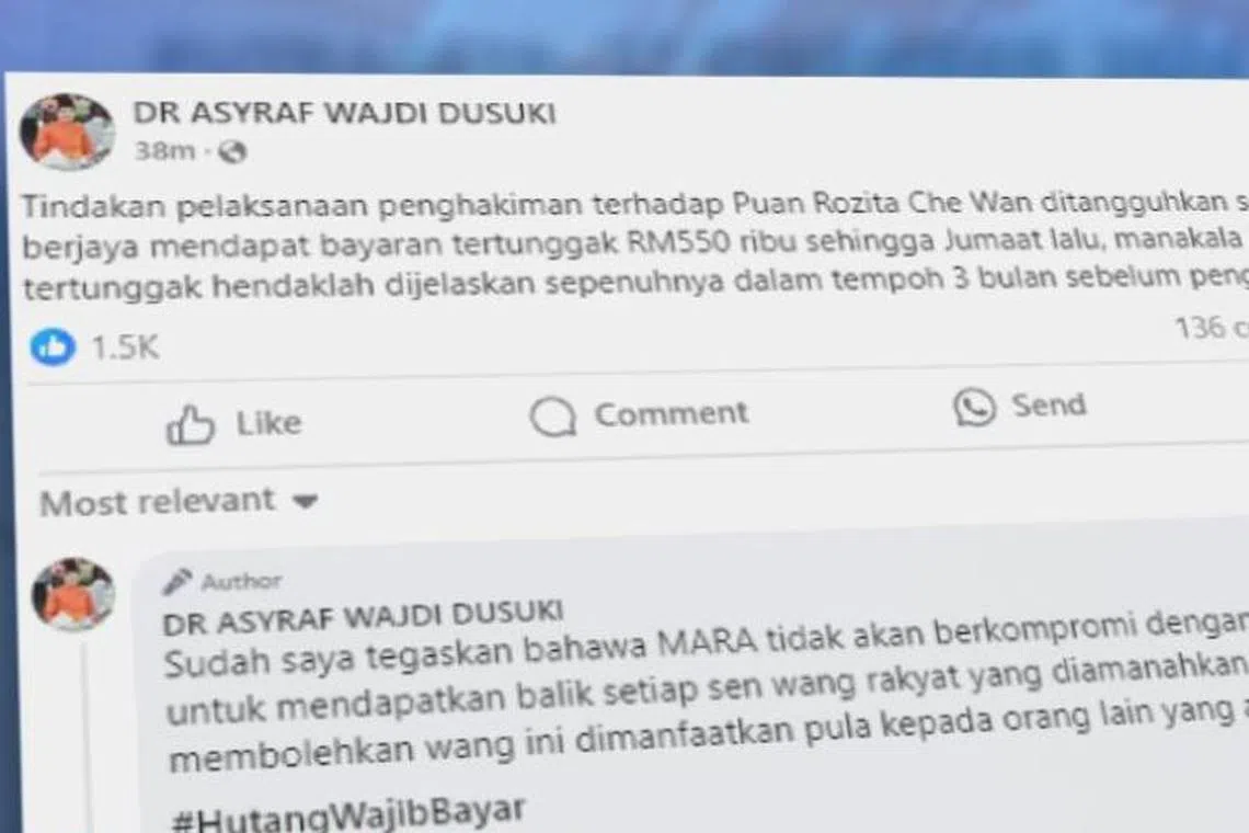“Tindakan pelaksanaan penghakiman terhadap Puan Rozita Che Wan ditangguhkan setelah Mara berjaya mendapat bayaran tertunggak RM550,000 sehingga Jumaat lalu,” katanya, lapor portal berita Buletin TV3.