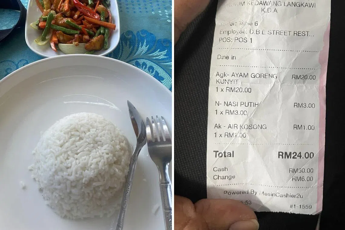 Ini selepas beliau didakwa dikenakan caj keseluruhan berjumlah RM24 bagi nasi putih berharga RM3, ayam goreng kunyit seorang makan berharga RM20 dan air kosong RM1.