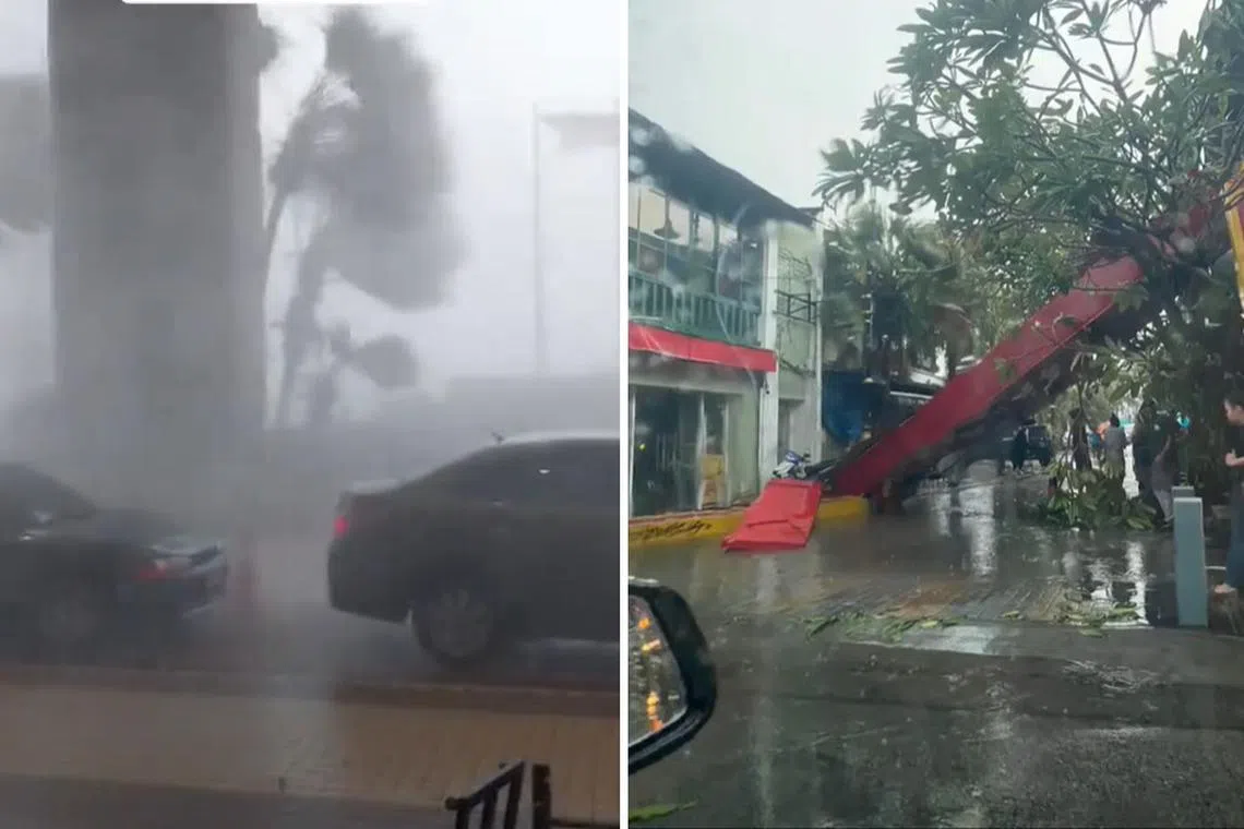 Dalam video itu, kelihatan pokok meliuk apabila angin kencang memukul daerah itu, dengan harta benda awam seperti papan perhentian jalan terjatuh di lantai, dan sampah dan serpihan melayang di udara.