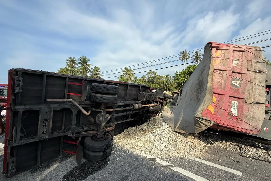 Perlanggaran itu amat kuat sehingga kedua-dua lori terbalik ke sebelah kiri masing-masing.