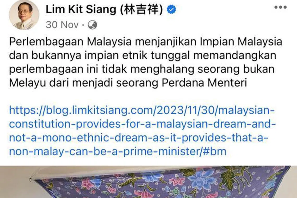 “Beliau mendakwa Perlembagaan Persekutuan tidak menyekat mana-mana orang bukan Melayu untuk menjadi perdana menteri, dengan sinis juga menyebut Malaysia tidak memerlukan 230 tahun lagi untuk melihat orang bukan Melayu menjadi perdana menteri,” katanya dalam kenyataan, lapor Berita Harian Malaysia pada 10 Disember.