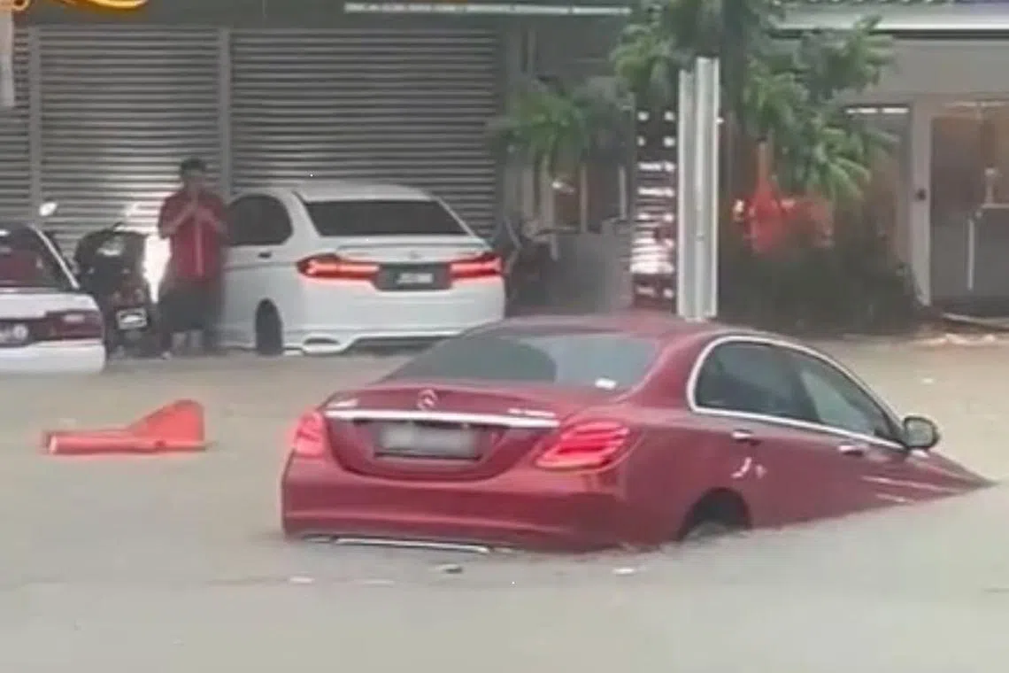 Dalam beberapa video diterbit di media sosial, kereta Mercedes-Benz C-180 berwarna merah itu kelihatan separuh tenggelam dan dibawa arus air di sebuah jalan raya.