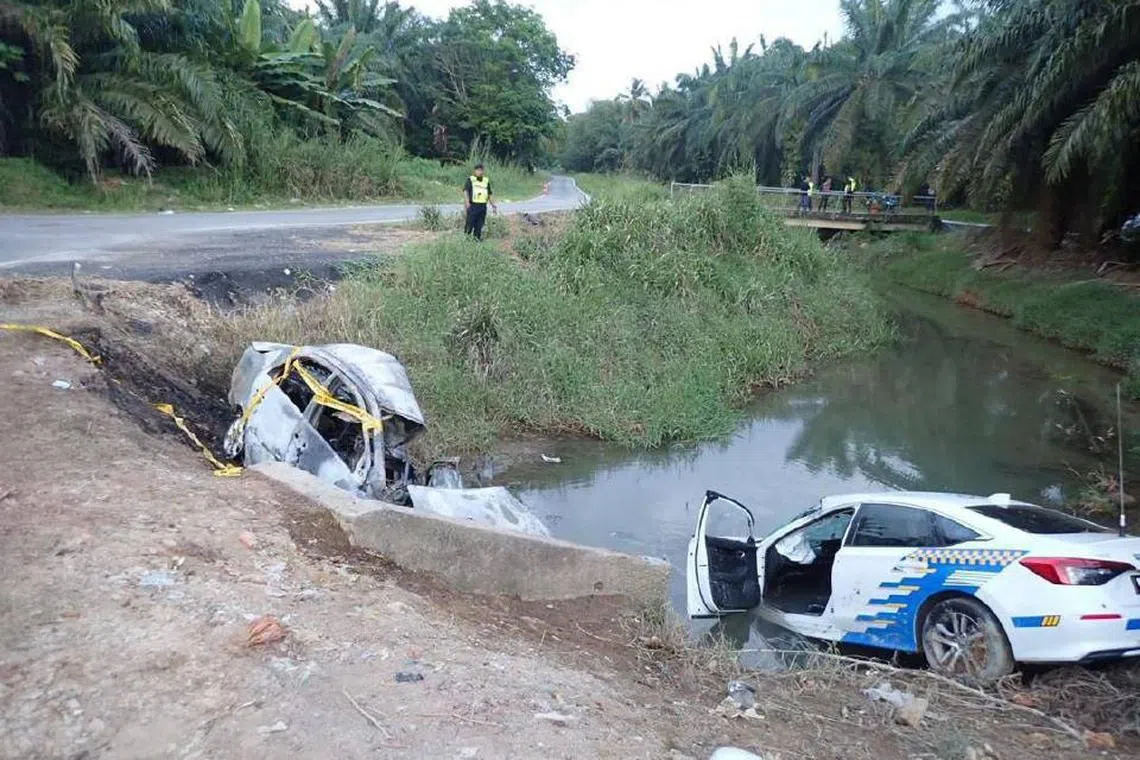 Dalam kemalangan sekitar 4 pagi itu, dua anggota polis turut cedera parah selepas kereta peronda yang mereka naiki turut terbabas ke dalam parit yang sama.