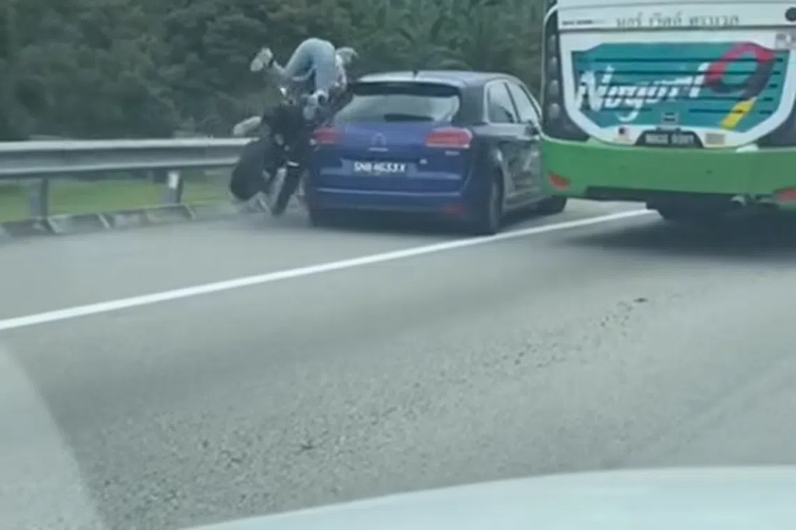 Sebuah motosikal yang kelihatan memecut laju di lorong kecemasan merempuh kereta itu dan kedua-dua penunggang dan pembonceng tercampak dari kenderaan mereka.