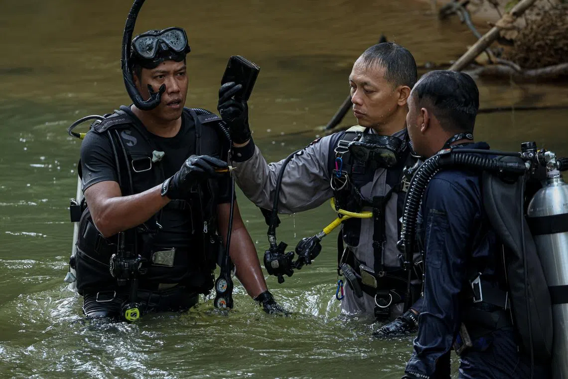 Pasukan penyelam dari Unit Siasatan Forensik Sub Akuatik Polis Diraja Malaysia (PDRM) menemukan beg duit dipercayai mempunyai kaitan dengan pembunuhan Allahyarhamha Nur Farah Kartini Abdullah ketika melakukan pencarian bahan bukti di Sungai Trolak di Kampung Batu 4, Trolak pada 22 Julai. - Foto BERNAMA