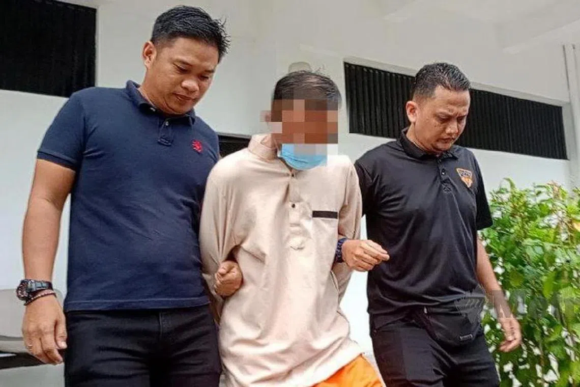 Suspek tiba di Mahkamah Majistret Batu Gajah pada 8.30 pagi dengan berpakaian baju Melayu dan berseluar lokap jingga dan dibawa masuk dengan iringan polis.