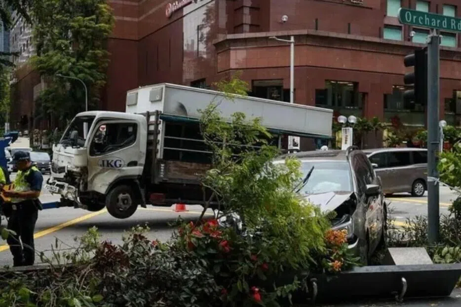 Foto yang diambil oleh pengguna jalan raya di lokasi kejadian menunjukkan sebuah lori dan sebuah kereta berada di atas tempat pejalan kaki, di hadapan gedung Apple Store di Orchard Road. Sebuah kereta polis turut kelihatan di belakang lori berkenaan.