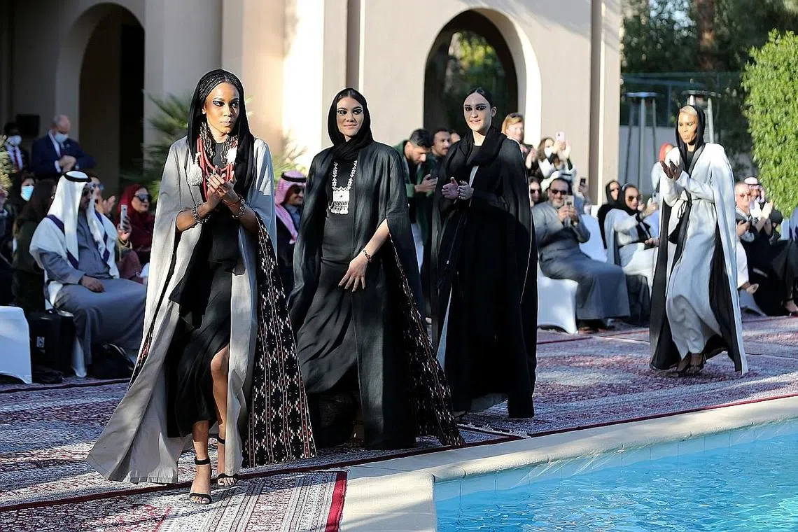 Sekumpulan pragawati Saudi memaparkan koleksi abaya terbaru Puteri Saudi Safia Hussain, semasa pertunjukan fesyen di Riyadh, Arab Saudi baru-baru ini. -