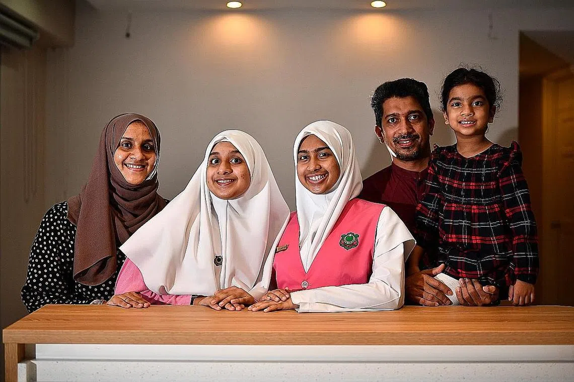 AKTIF DI SEKOLAH: Meskipun perlu mempersiapkan diri untuk menghadapi peperiksaan penting, Ayra (tengah) kekal aktif menyumbang di sekolah. Ibu bapanya Encik Mohammed Kutty (dua dari kanan) dan Cik Shifa Kammana Abdulla (kiri) sentiasa memberi kata perangsang. Turut bergambar bersama mereka adalah adik Ayra, Naurah (kanan) dan Sarah (dua dari kiri). - Foto BH oleh LIM YAOHUI -