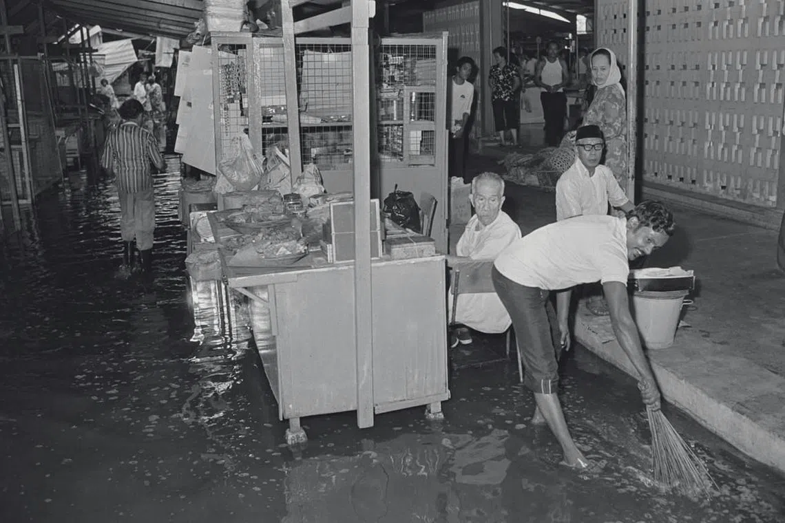 SEORANG pegerai di pasar Geylang Serai menggunakan penyapu lidi untuk membersihkan longkang selepas hujan lebat menyebabkan banjir kilat di kawasan itu, dalam gambar yang disiarkan buat kali pertama pada 1980 ini.