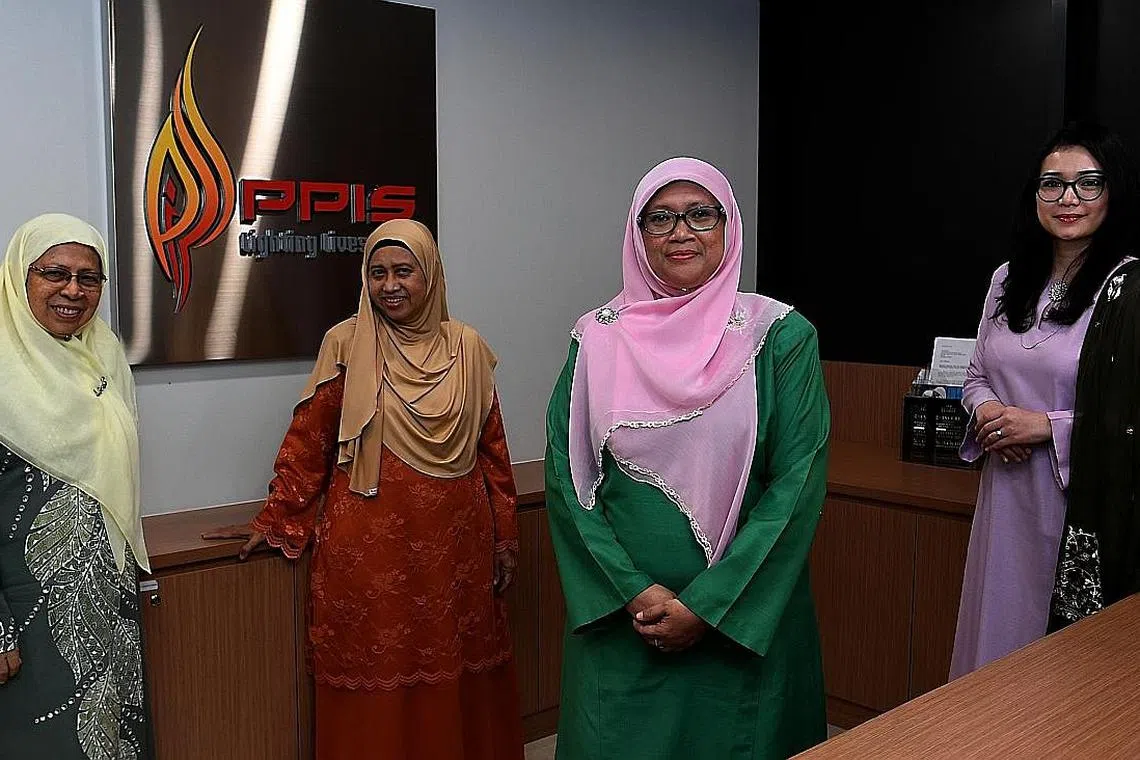 MAJUKAN WANITA: Cik Rahayu Mohamad (dua dari kanan) bersama beberapa pemimpin PPIS lain termasuk (dari kanan) Cik Hazlina Abdul Halim, Cik Sapiah Molla, dan Cikgu Fatimah Azimullah. PPIS bertekad mahu terus berusaha memajukan kehidupan wanita Muslim setempat. - Foto BH oleh KHALID BABA -