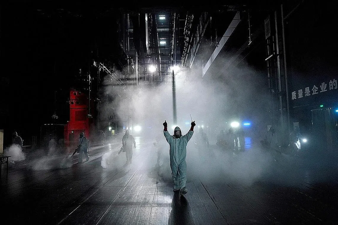 PUSAT: Sukarelawan daripada pasukan Penyelamat Langit Biru membasmi kuman di Teater Besar Qintai di Wuhan, wilayah Hubei, China - pusat pandemik Covid-19 pada 2 April 2020. - Foto fail -