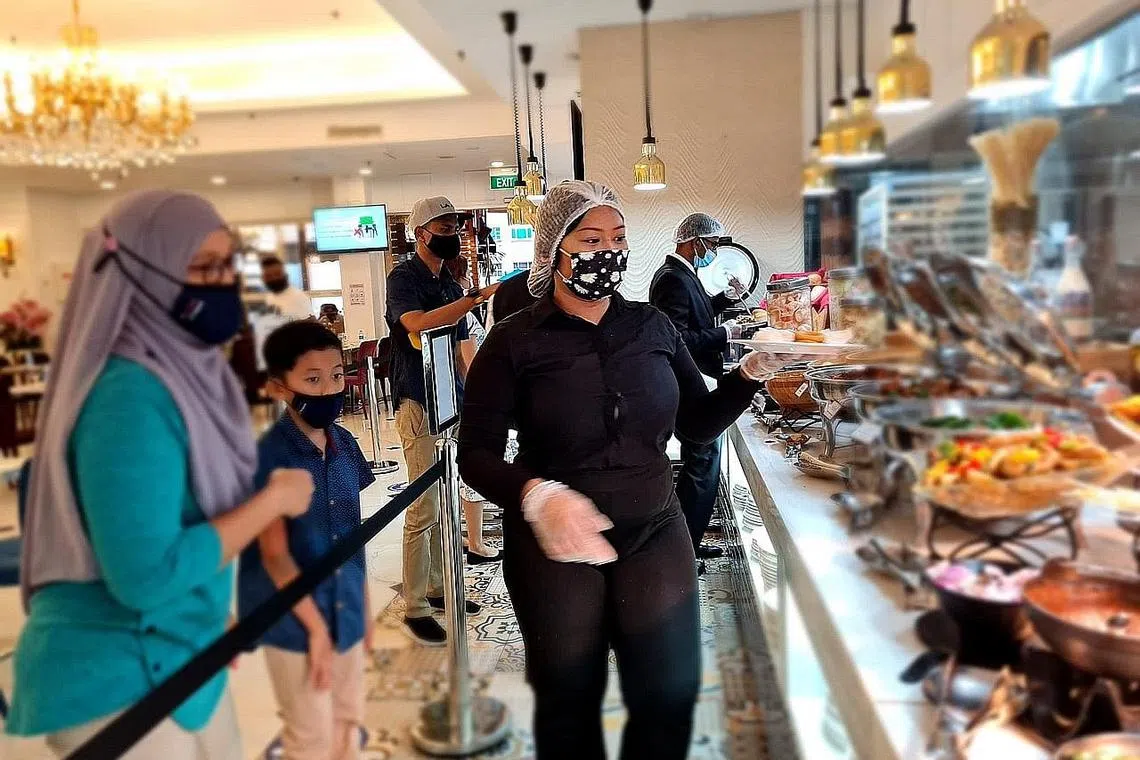 SEPERTI kebanyakan restoran yang menyediakan bufet, The Landmark di Village Hotel Bugis juga perlu menghadapi cabaran dengan pelaksanaan langkah-langkah pengurusan selamat yang berbeza sepanjang tempoh pandemik Covid-19 ini.