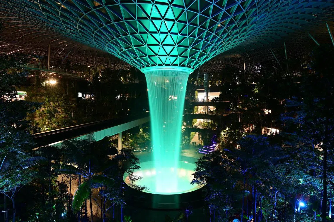 Bangunan dan mercu tanda ikonik negara seperti Jewel Rain Vortex di Jewel Lapangan Terbang Changi bergemerlapan dengan cahaya hijau pada 26 Jun sebagai mencerminkan sokongan kukuh rakan kongsi masyarakat dalam usaha mengatasi masalah dadah di sini. - Foto BIRO NARKOTIK PUSAT
