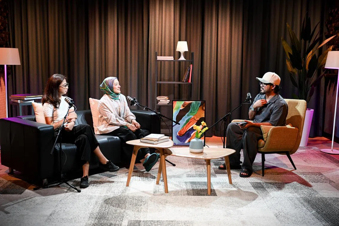 Dyn Norahim berkongsi harapannya untuk menjadi ‘suara agama’ menerusi jenama barunya, Soutudeen bersama wartawan Berita Harian, Cik Shiqin Ramadan (kiri) dan juga penerbit dan penyampai podcast, Cik Natasha Mustafa. - Foto BH oleh SHAFIQ APANDI
