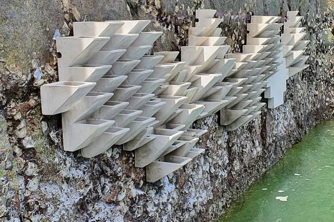 350 dipasang di Changi Bay, 60 di Sentosa; sokong 20-25 spesies berbanding 10 yang disokong tembok laut granit tradisional