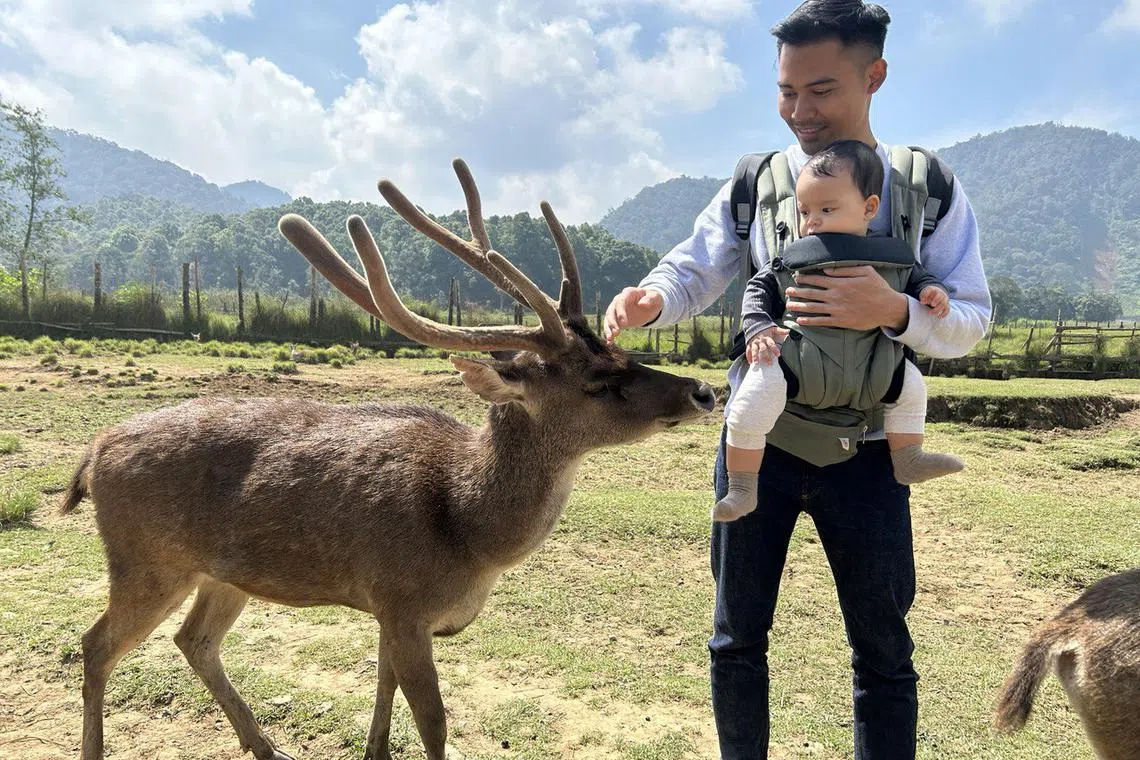 PENGALAMAN BARU: Anak penulis yang ketika itu berusia sembilan bulan didedahkan kepada persekitaran dan pengalaman baru memberi makan dan bermesra dengan rusa yang dibiarkan bebas berkeliaran di sebuah taman pemuliharaan rusa di Bandung, Indonesia. - Foto BH oleh NUR FATHIN AWALLUDIN