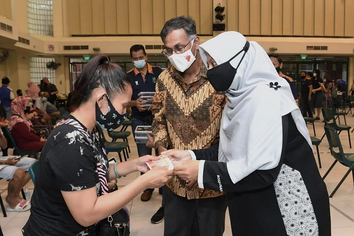 HABUAN RAMADAN: Setiausaha agung Persatuan Muhammadiyah, Cik Roszanah Abdul Salim (bertudung), menyampaikan habuan kepada seorang penerima dalam satu acara Ramadan di Bukit Batok. Bersama mereka ialah Encik Murali Pillai, Anggota Parlimen dan penasihat pertubuhan akar umbi Bukit Batok. - Foto fail -