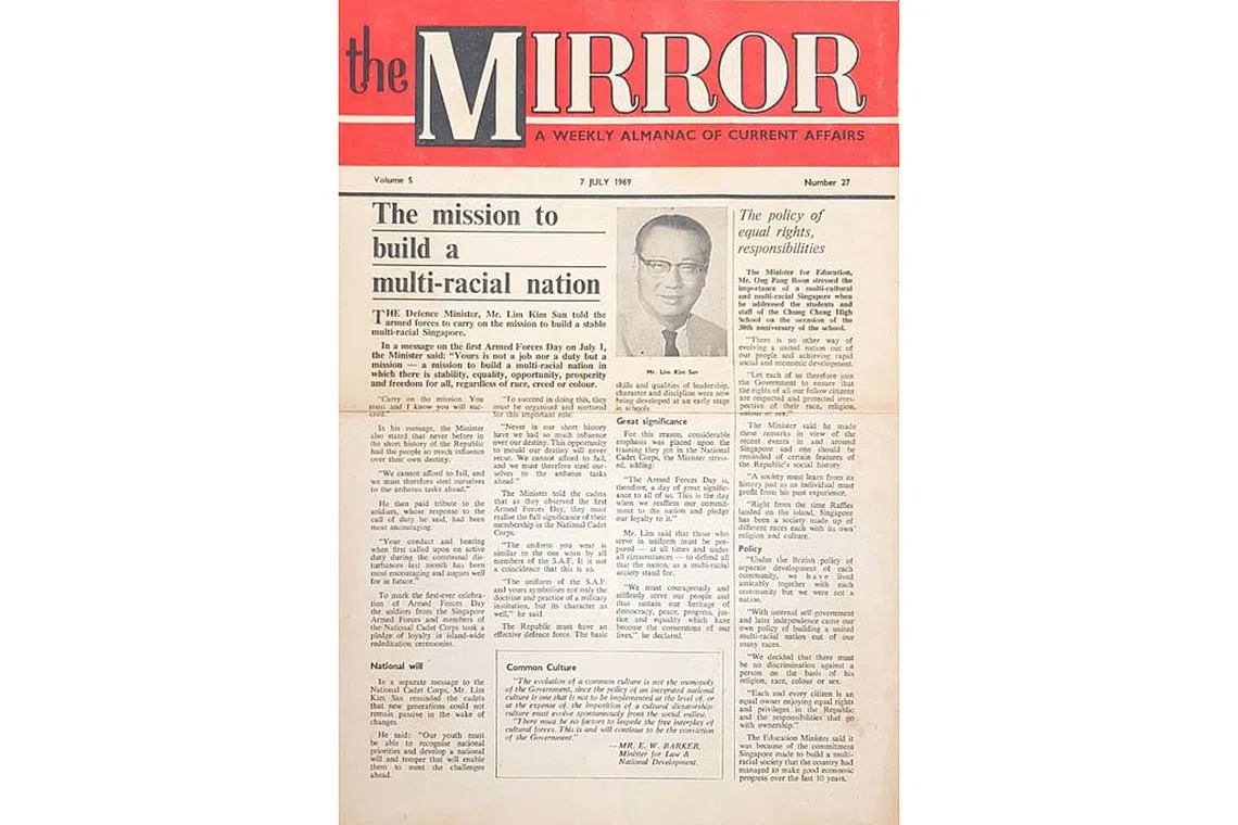 HARI BERSEJARAH: Berita SAF di 'MIRROR' (1 Julai 1969). Hari Angkatan Bersenjata Singapura yang pertama, kini dikenali secara ringkas sebagai Hari SAF - telah disambut pada 1 Julai 1969 dengan perarakan besar dan perarakan lalu di Stadium Jalan Besar dipengerusikan oleh Menteri Dalam Negeri merangkap Pertahanan ketika itu, Encik Lim Kim San. Pada hari istimewa itu, para tentera bersenjata berikrar kesetiaan mereka dan memberikan dedikasi sepenuhnya kepada Angkatan Bersenjata Singapura (SAF) dan bangsa. Ia juga membolehkan mereka merenung peranan dan tanggungjawab mereka dalam mempertahankan bangsa. Bagi Encik Dan Teo, seorang pengumpul poster dan pemilik artikel itu yang dijumpainya di luar negara, artifak ini mengingatkannya sumbangan pemimpin pengasas seperti Encik Lim Kim San. Sumbangan: Encik Dan Teo. - Foto FOUNDERS' MEMORIAL COMMITEE -
