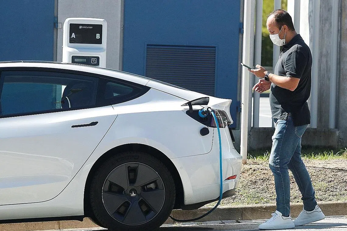 BERSAMA TANGANI PEMANASAN GLOBAL: Seorang lelaki memeriksa telefon bimbit sementara beliau mengecas kereta elektrik Tesla di Sant Cugat del Valles, berdekatan Barcelona, Sepanyol. - Foto REUTERS -