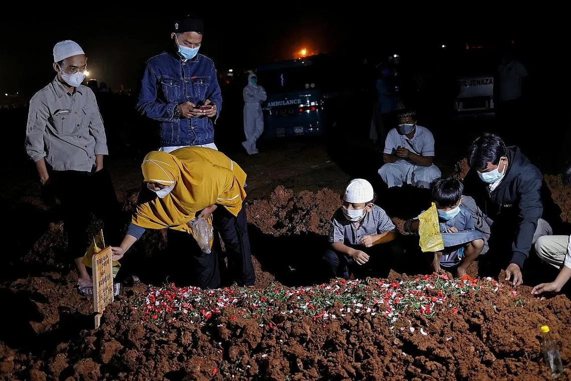 KEHILANGAN BAPA: Dua kanak-kanak menghadiri pengebumian bapa mereka, yang meninggal dunia akibat Covid-19, bersama ibu mereka di tanah perkuburan yang disediakan pemerintah di Bekasi, di luar Jakarta, pada 27 Julai. - Foto REUTERS -