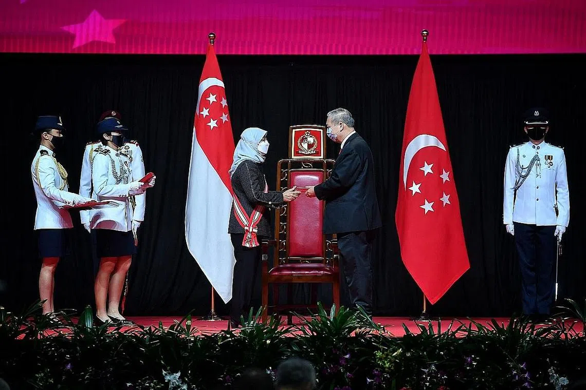 MENDAPAT PENGIKTIRAFAN: Profesor Fong menerima pingat Pentadbiran Awam (Emas) daripada Presiden Halimah Yacob baru-baru ini. - Foto BH oleh CHONG JUN LIANG -