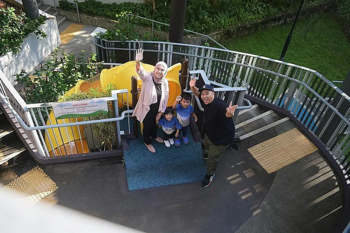 NIKMATI KEMUDAHAN: Cik Nur Hafizah Kamarulzaman dan suami, Encik Mohamad Fadhli Mohamad Hata, bersama anak mereka - Mohamad Rayhan (dua tahun) dan Mohamad Rauf (empat tahun) - merupakan keluarga muda di Canberra Crescent dan tidak sabar menikmati kemudahan baru Bukit Canberra yang terletak dua perhentian bas dari rumah mereka. - Foto BH oleh HARITH MUSTAFFA -