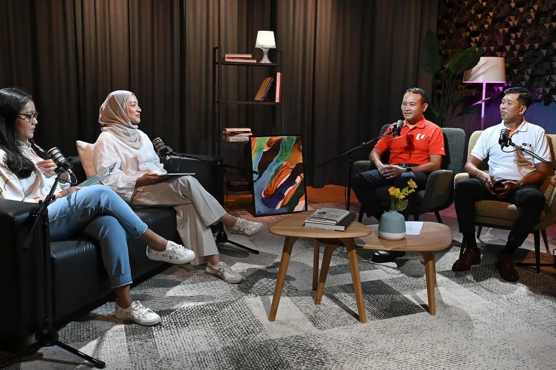 Pengarah Divisyen Operasi dan Mobilisasi, Kongres Kesatuan Sekerja Kebangsaan (NTUC), Encik Mohd Fahmi Aliman, yang juga mayor Majlis Pembangunan Masyarakat (CDC) South East (dua dari kanan), dan anggota jawatankuasa eksekutif Persatuan Pekerja Penghantaran Nasional (NDCA), Encik Mohammad Shaffiee Abdullah, bersembang tentang Rang Undang-Undang Pekerja Platform, bersama Koresponden BH, Cik Irma Kamarudin (kiri); dan Penerbit yang juga Penyampai NoTapis, Cik Natasha Mustafa. - Foto BH oleh KHALID BABA