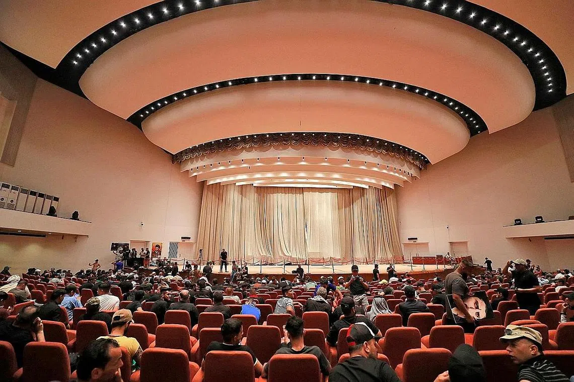 SERANG PARLIMEN: Penyokong pemimpin Syiah, Encik Moqtada al-Sadr, menguasai Parlimen Iraq pada 4 Ogos lalu, hari keenam serbuan dilakukan sebagai membantah pencalonan daripada puak yang bersaing bagi kedudukan perdana menteri di kawasan Zon Hijau yang dikawal ketat di Baghdad. Hampir 10 bulan selepas berakhirnya pilihan raya, negara 40 juta penduduk itu masih tiada pemerintah, perdana menteri atau presiden baru, disebabkan pertelagahan antara puak dalam membentuk satu perikatan. - Foto AFP -