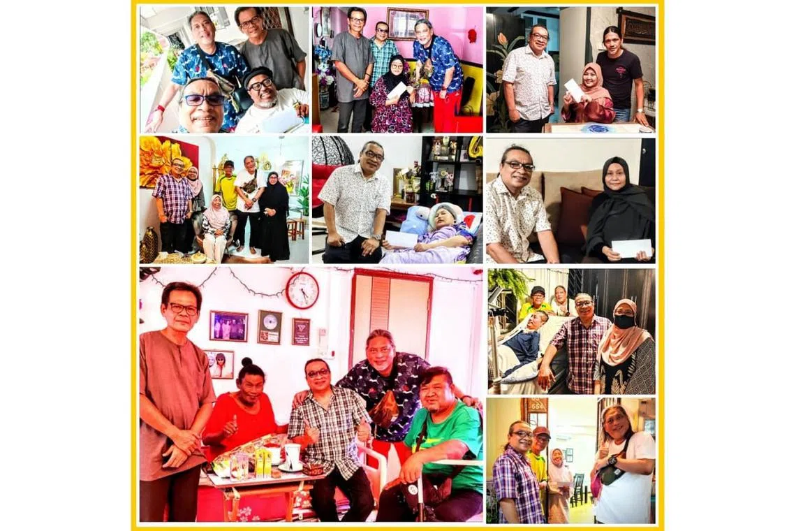 PRIHATIN MASYARAKAT: Rencaman gambar menunjukkan Presiden Prihatin, Joe Jasmi (gambar kiri paling atas, berbaju kelabu) dan Timbalan Presiden Prihatin, Moliano Rasmad (kiri), bersama pelakon mapan, Keatar HM (dua dari kiri), menyampaikan sumbangan kepada 10 artis atau penggiat seni yang uzur dan berpenyakit kronik, atau kepada ahli keluarga mereka. - Foto PRIHATIN (PENGGIAT SENI MELAYU SINGAPURA) -