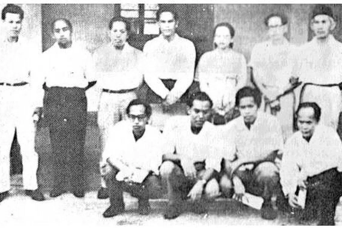 BARISAN PERINTIS: Dibentuk pada 8 Julai 1956 - Jawatankuasa Pertama Perkumpulan Seni dan beberapa tokoh seni: (Berdiri dari kiri) Bani Buang, Mansor Fadzal, Asraf Hj Abdul Wahab (jawatankuasa), Abdullah Salehy (setiausaha dua), Fatimah Murad (bendahari), Cikgu Mahmud Ahmad (pengerusi perjumpaan), Pak Zubir Said (jawatankuasa); (duduk dari kiri) Abdul Ghani Hamid (ketua dua), Hussein Jahidin (setiausaha satu), Usman Awang (jawatankuasa) dan Dahari Jar (jawatankuasa). Tiada dalam gambar ialah H. M. Rohaizat (ketua satu). -