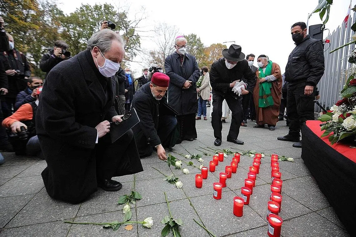 PEMIMPIN PELBAGAI AGAMA PERINGATI KORBAN VIENNA: Para pemimpin Protestan, Katolik dan Islam memberi penghormatan kepada korban pengganasan di Vienna, di luar Kedutaan Austria di Berlin minggu lalu. - Foto AFP -