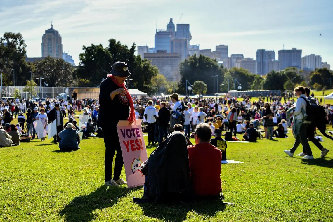 Pada Ahad, satu ciapan Majlis Perkhidmatan Sosial Australia menunjukkan para hadirin, dalam perhimpunan di Sydney, dengan berkemeja-T yang tertera perkataan “Undi Ya” dan topi dengan perkataan “Kenyataan Uluru”, merujuk kepada dokumen penting yang memerlukan Suara Orang Asli.