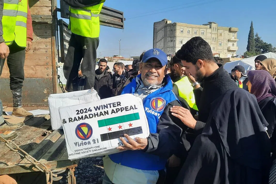 Selaku duta badan kebajikan, Vision 21, Encik Mohamed Anwar Tahar (berjaket biru), turun padang ke Aleppo, Syria, bagi menjalankan misi kemanusiaan dengan menyediakan pelbagai bantuan makanan dan keperluan harian untuk penduduk di sana. - Foto ihsan MOHAMED ANWAR TAHAR