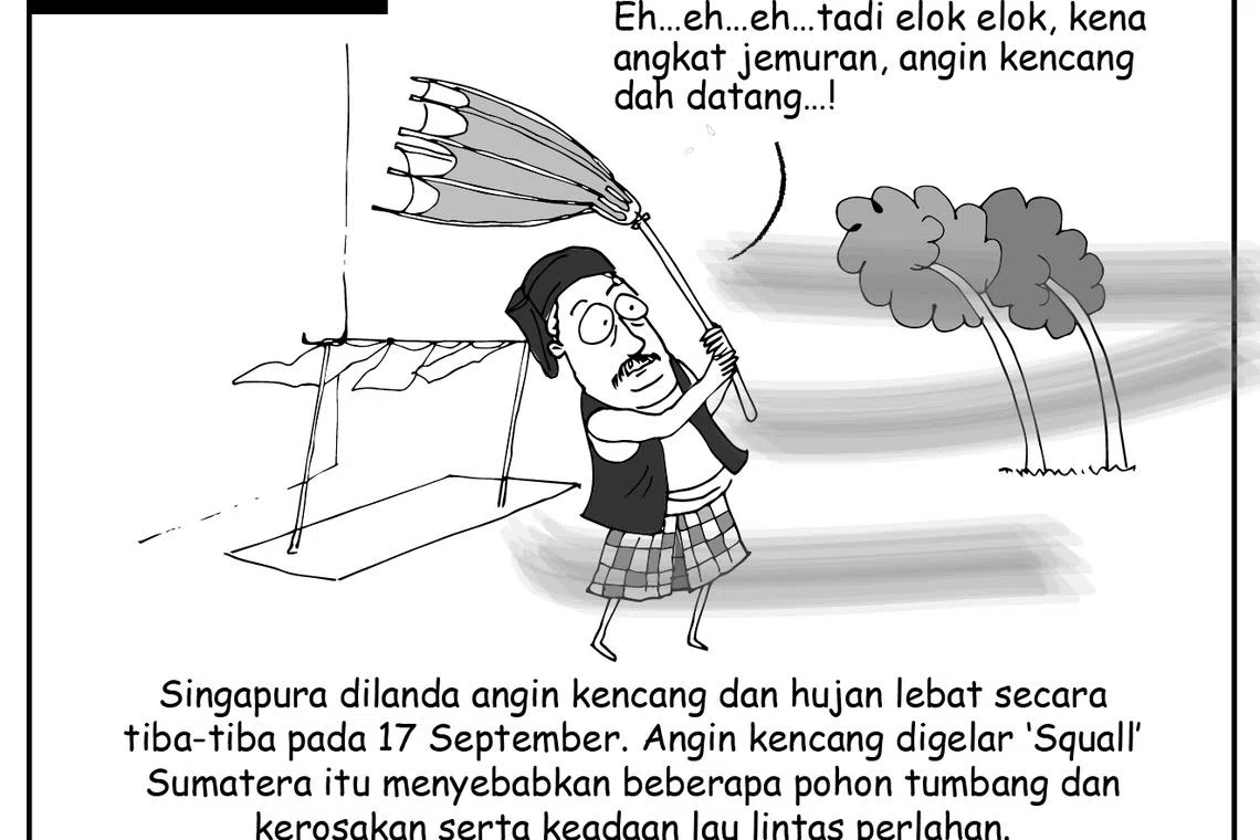Singapura dilanda aingin kecang dan hujan lebat pada 17 September. - Kartun BH oleh MOHD SAMAD AFANDIE