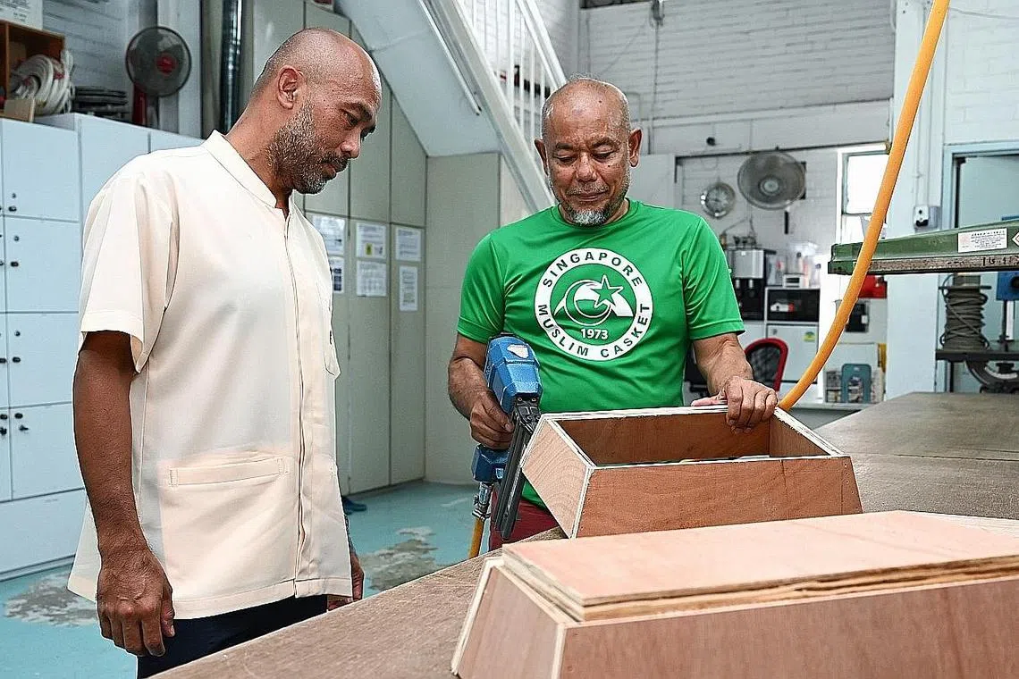 KELENGKAPAN BAGI PENGURUSAN JENAZAH: Encik Iskandar (kiri) melihat kakitangan, Encik Mohd Ramlee Mohd Ali, membuat papan long di kilang Singapore Muslim Casket & Marble Contractor yang terletak di Geylang Bahru. Syarikat itu dipercayai satu-satunya syarikat pengurusan jenazah Islam yang mempunyai kilang kecil untuk membuat papan long. -