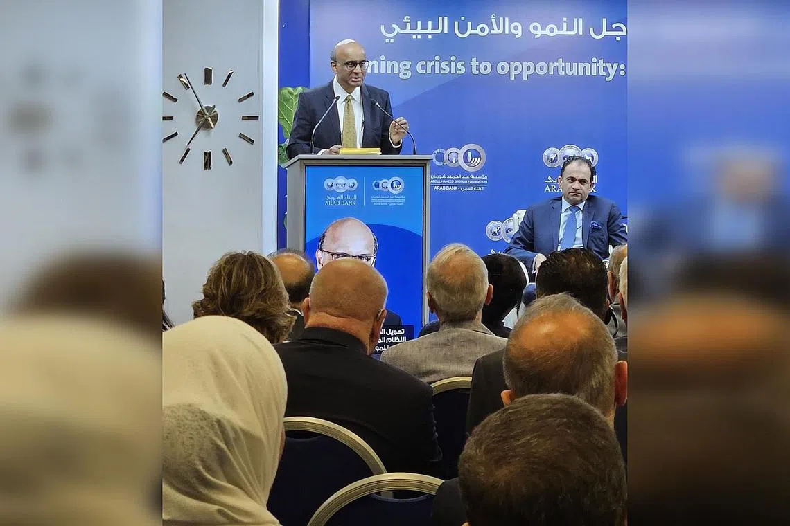 REFORMASI KEWANGAN GLOBAL: Encik Tharman Shanmugaratnam mengupas tentang reformasi kewangan global dalam satu ceramah anjuran Yayasan Shoman di Amman, Jordan pada 14 Mei lalu. - Foto MFA -