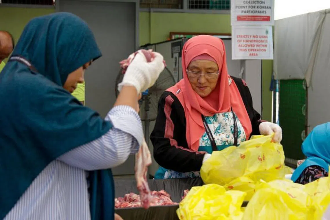 SERATUS benefisiari menerima daging korban daripada Jamiyah Singapura pada Ahad (11 Ogos, dalam satu majlis khas di rumah tumpangan sementara Darul Islah.