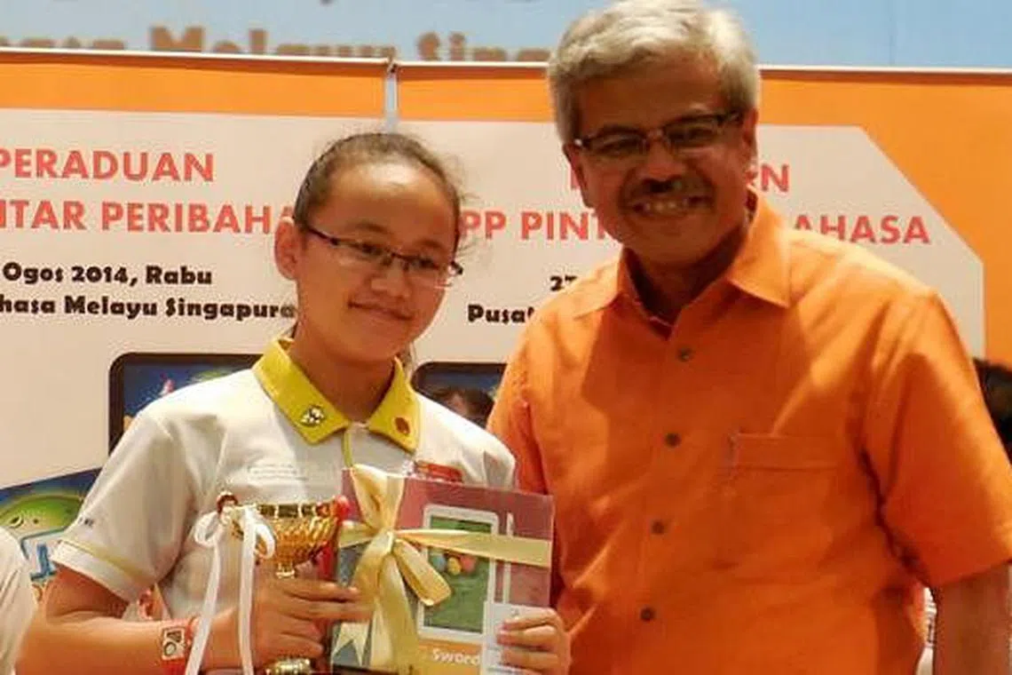 DENGAN HADIAH KEMENANGAN: Nurul Janna Muhammad Muhiddin bergambar bersama Encik Mohd Noh Daipi selepas menerima hadiah kemenangan dalam peraduan yang dianjurkan Pusat Bahasa Melayu Singapura pada Rabu lalu. - Foto MOHD RAMAN DAUD -