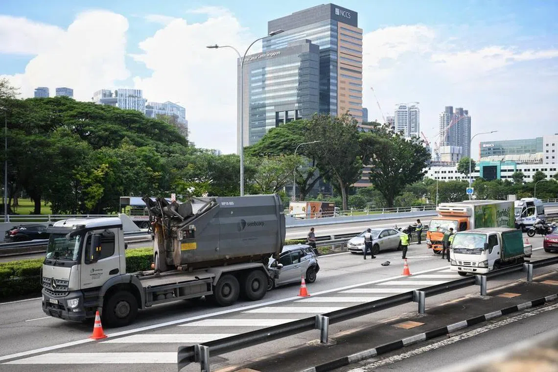Apabila The Straits Times tiba di tempat kejadian pada 10 pagi, sebuah kereta kelihatan mengalami kerosakan yang teruk, di belakang lori Sembcorp di tengah jalan.