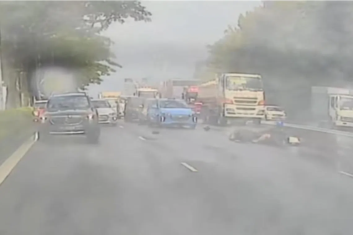 Seketika kemudian, sebuah motosikal juga dilihat terbabas dan penunggangnya tercampak ke bahagian hadapan lorong ketiga PIE itu.