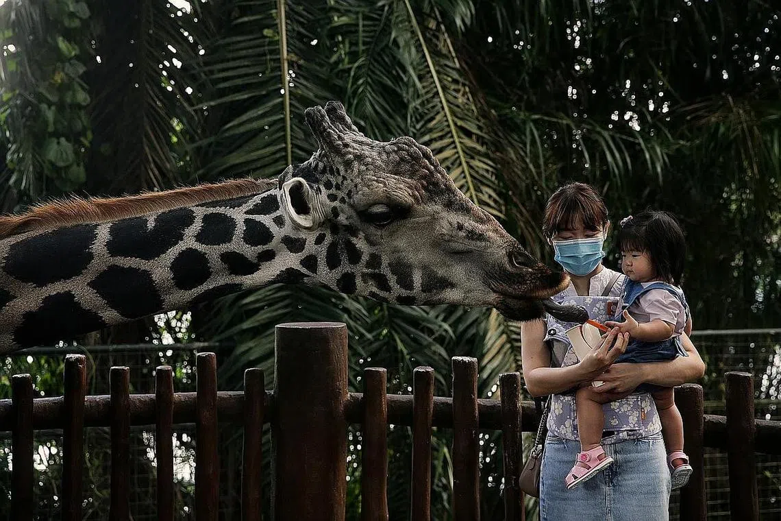 BERI MAKAN: Pengunjung semalam memberi makan kepada Marco, zirafah berusia 16 tahun, di Taman Haiwan Singapura yang dibuka selepas ditutup tiga bulan. - Foto BH oleh KEVIN LIM -