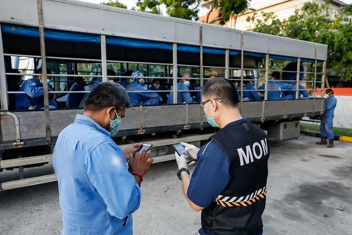 SAMAN JIKA GAGAL IKUT PERATURAN: Operasi penguatkuasaan berbilang agensi dilakukan di seluruh Singapura untuk memastikan majikan, syarikat pengangkutan dan pemandu lori mengikut langkah jarak selamat yang ditetapkan. 28 majikan sudah didenda kerana melanggar langkah itu. - Foto FACEBOOK/KEMENTERIAN TENAGA MANUSIA -
